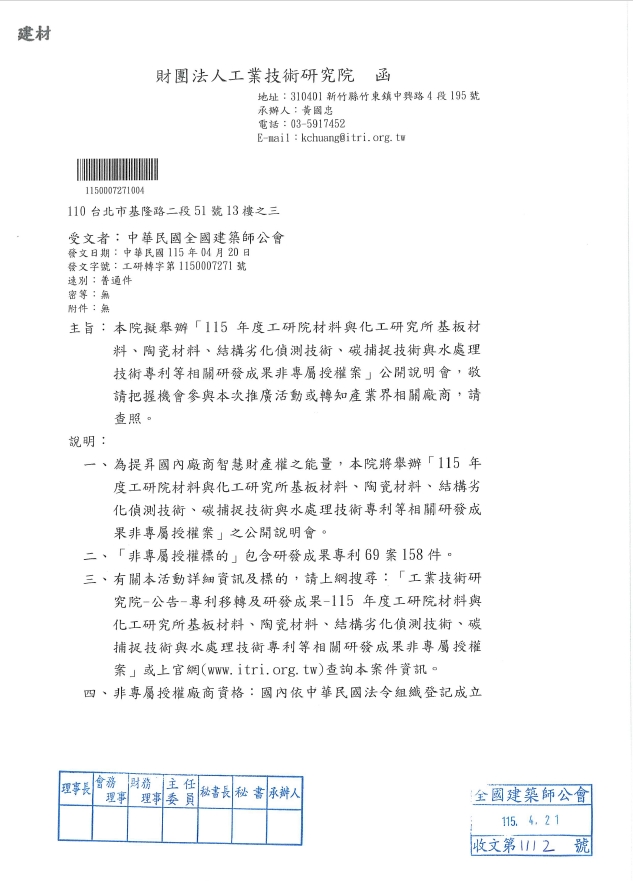 有關財團法人工業技術研究院擬舉辦「115年度工研院材料與化工研究所基板材料、陶瓷材料、結構劣化偵測技術、碳捕捉技術與水處理技術專利等相關研發成果非專屬授權案」公開說明會,請查照。